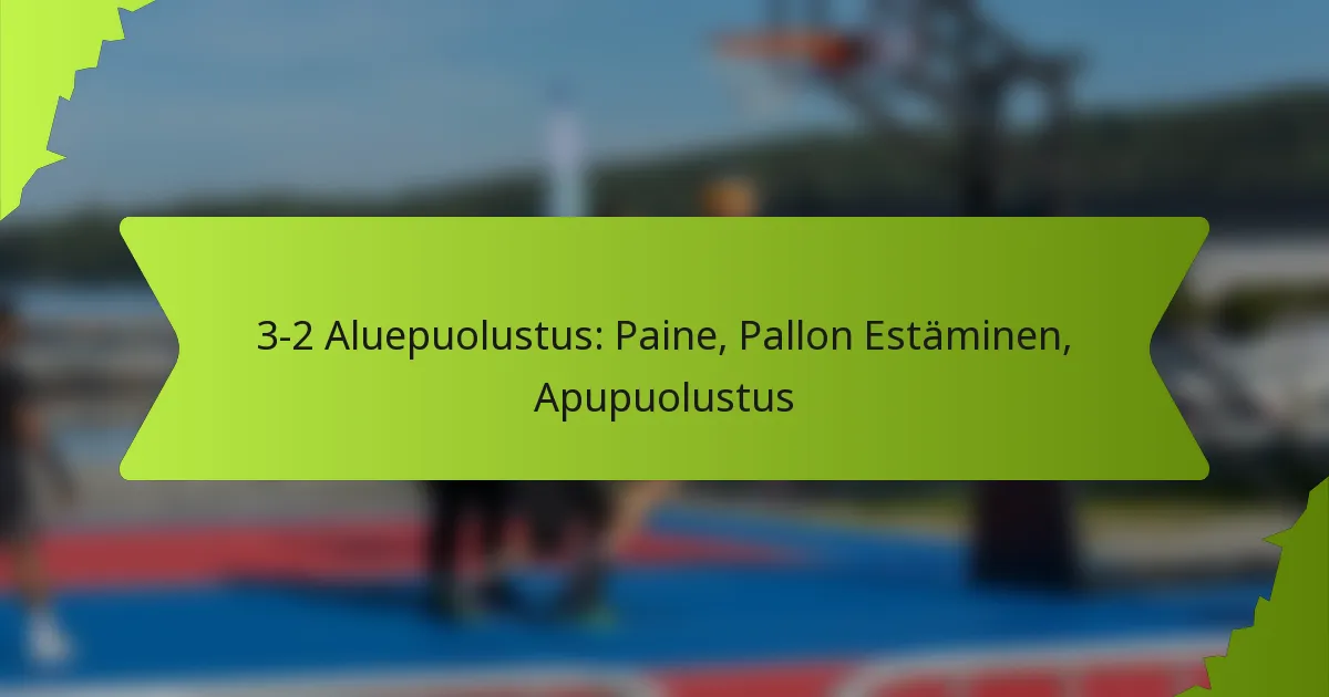 3-2 aluepuolustus on strateginen koripallomuoto, jossa kolme pelaajaa puolustaa ympäristöä ja kaksi suojaa maalia, rajoittaen tehokkaasti ulkoshootingia ja tukien ajoja koriin. Tämä puolustusmenetelmä sisältää painostustaktiikoita vastustajan pelin häiritsemiseksi sekä pallon estostrategioita estääkseen avainpelaajia saamasta palloa pisteytysalueilla, tavoitteenaan vähentää heidän pisteytysmahdollisuuksiaan.