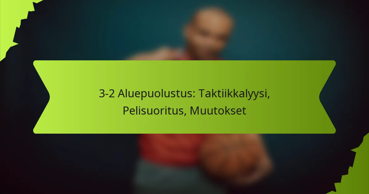 3-2 aluepuolustus on strateginen koripallomuoto, joka on suunniteltu tasapainottamaan ulkopuolista ja sisäistä puolustusta, jossa kolme pelaajaa keskittyy ulkopuolen vartioimiseen ja kaksi maalin suojaamiseen. Tämä puolustustapa rajoittaa tehokkaasti ulkopuolisia heittoja ja häiritsee hyökkäyksen rytmiä, mutta siinä on myös heikkouksia, joita taitavat vastustajat voivat hyödyntää. Pelisuorituksen analysointi ja tarvittavien säätöjen tekeminen ovat olennaisia tämän puolustustavan tehokkuuden maksimoimiseksi.